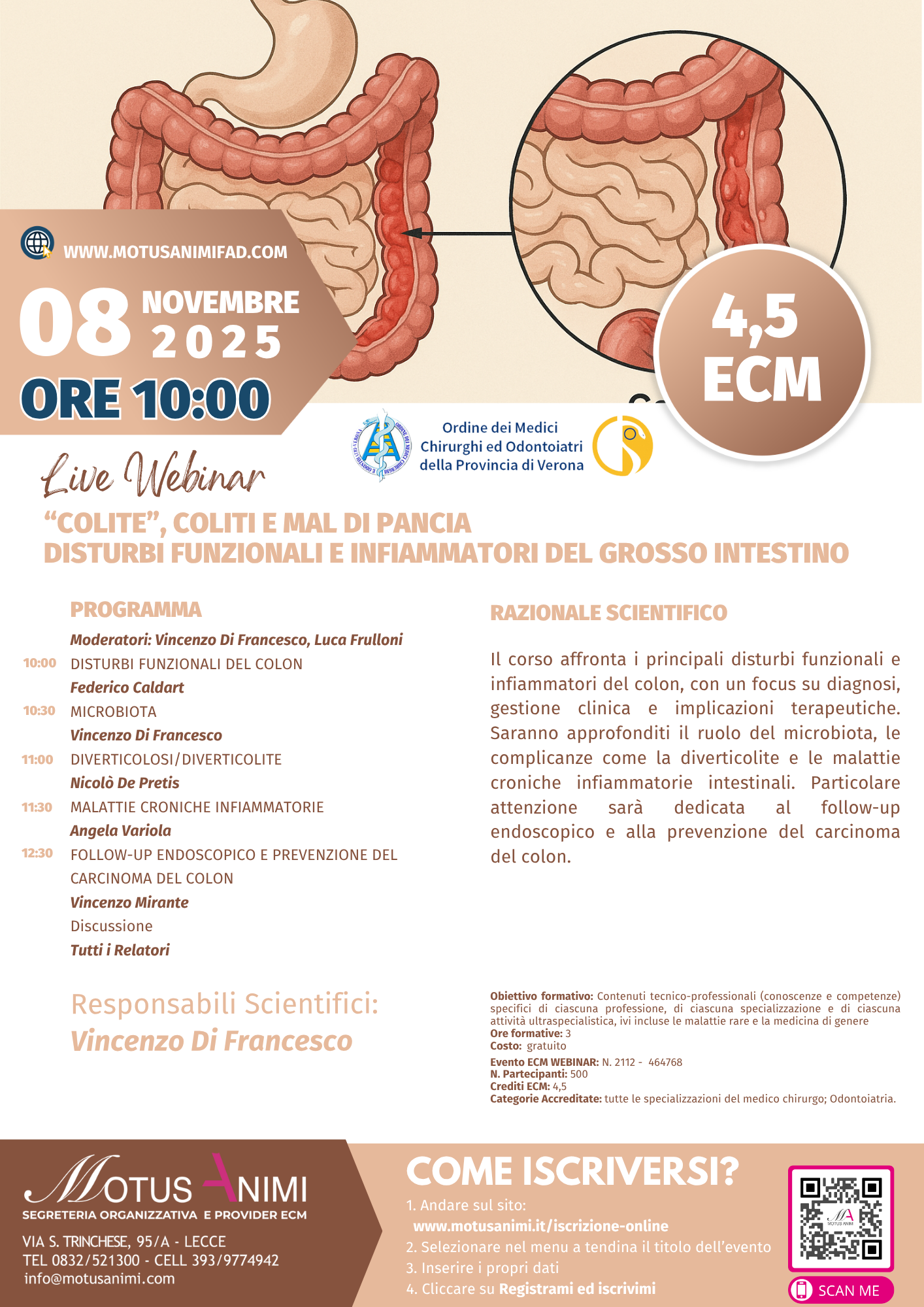 Iscrizioni collegandosi al seguente link: https://www.motusanimi.it/event/colite-coliti-e-mal-di-pancia-disturbi-funzionali-e-infiammatori-del-grosso-intestino/